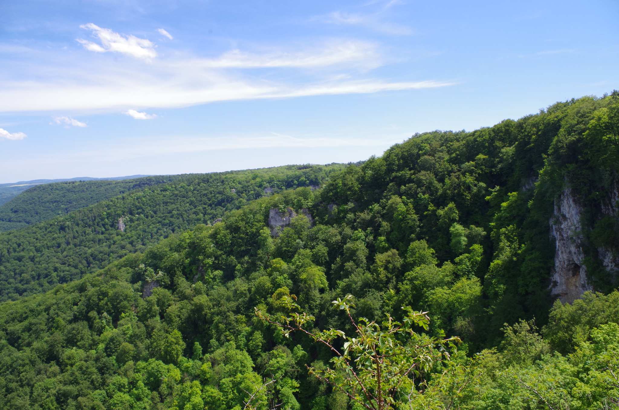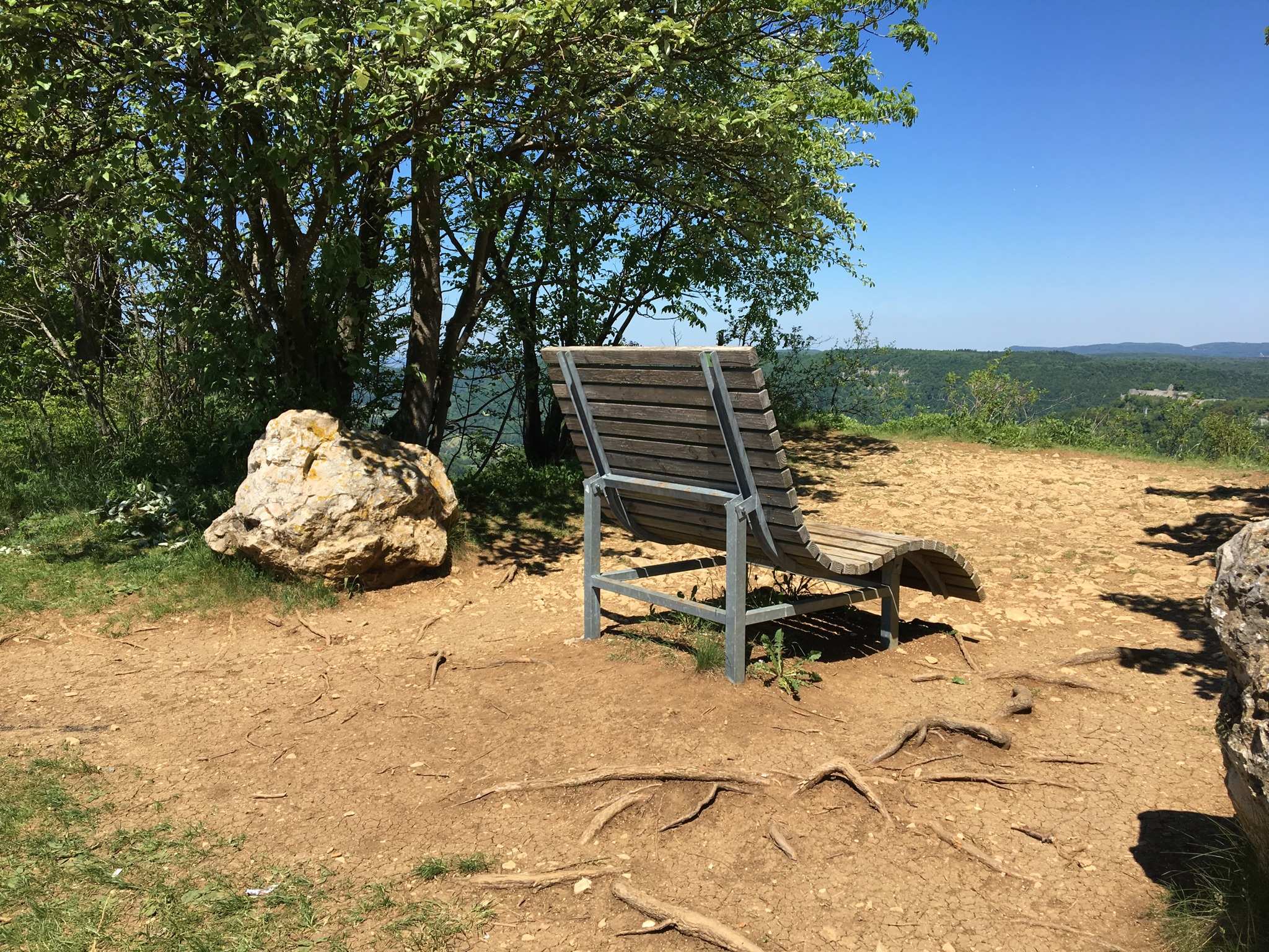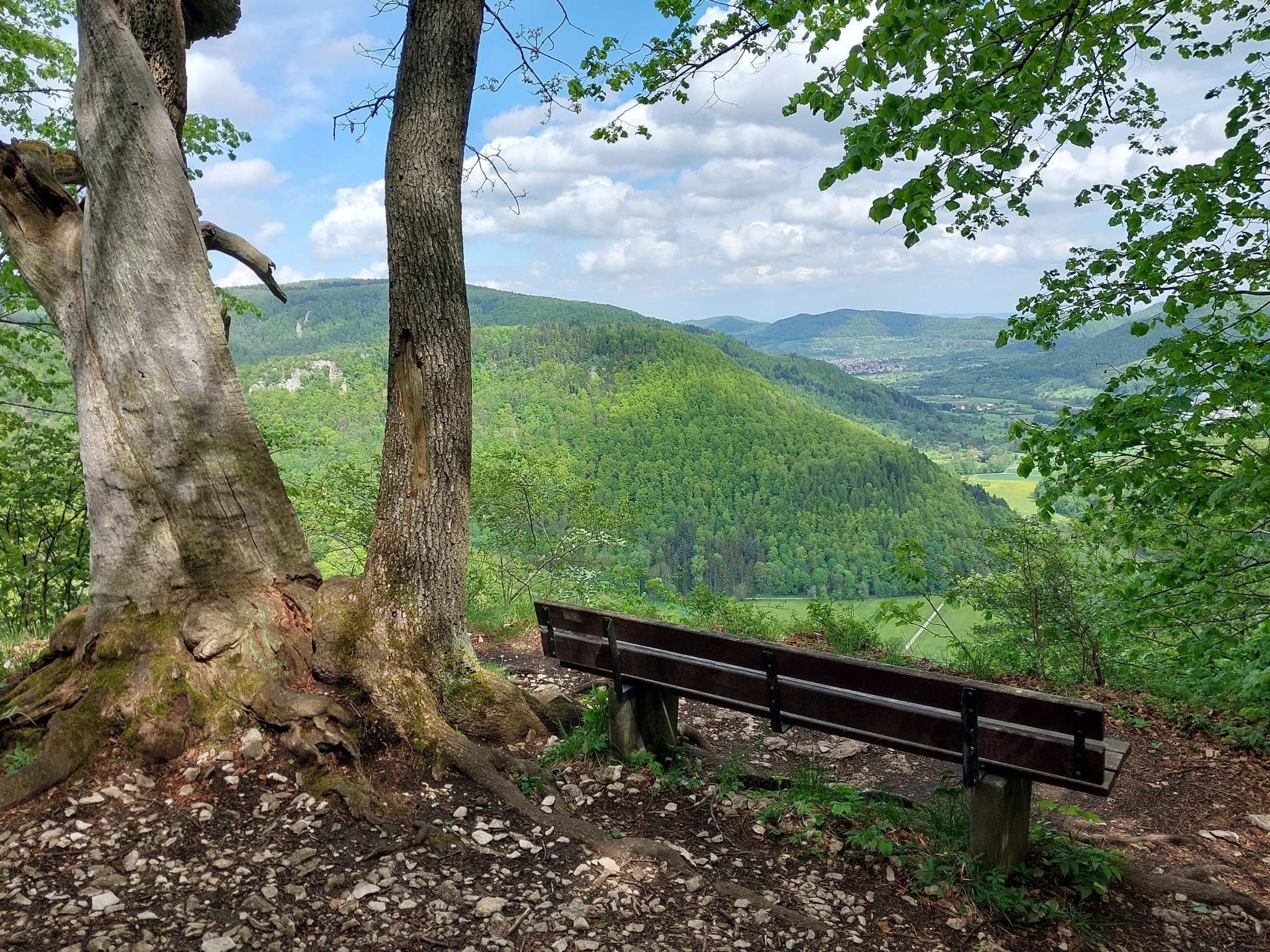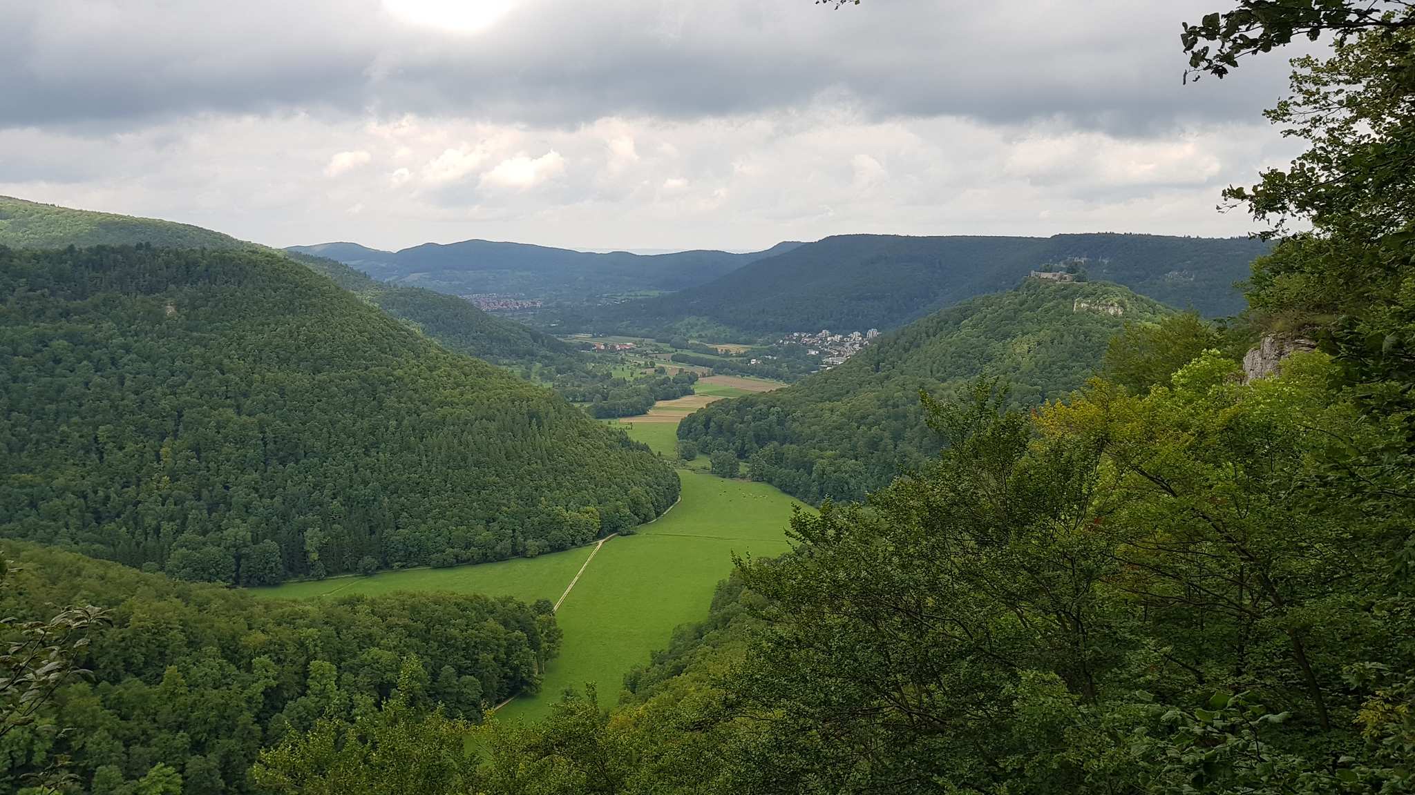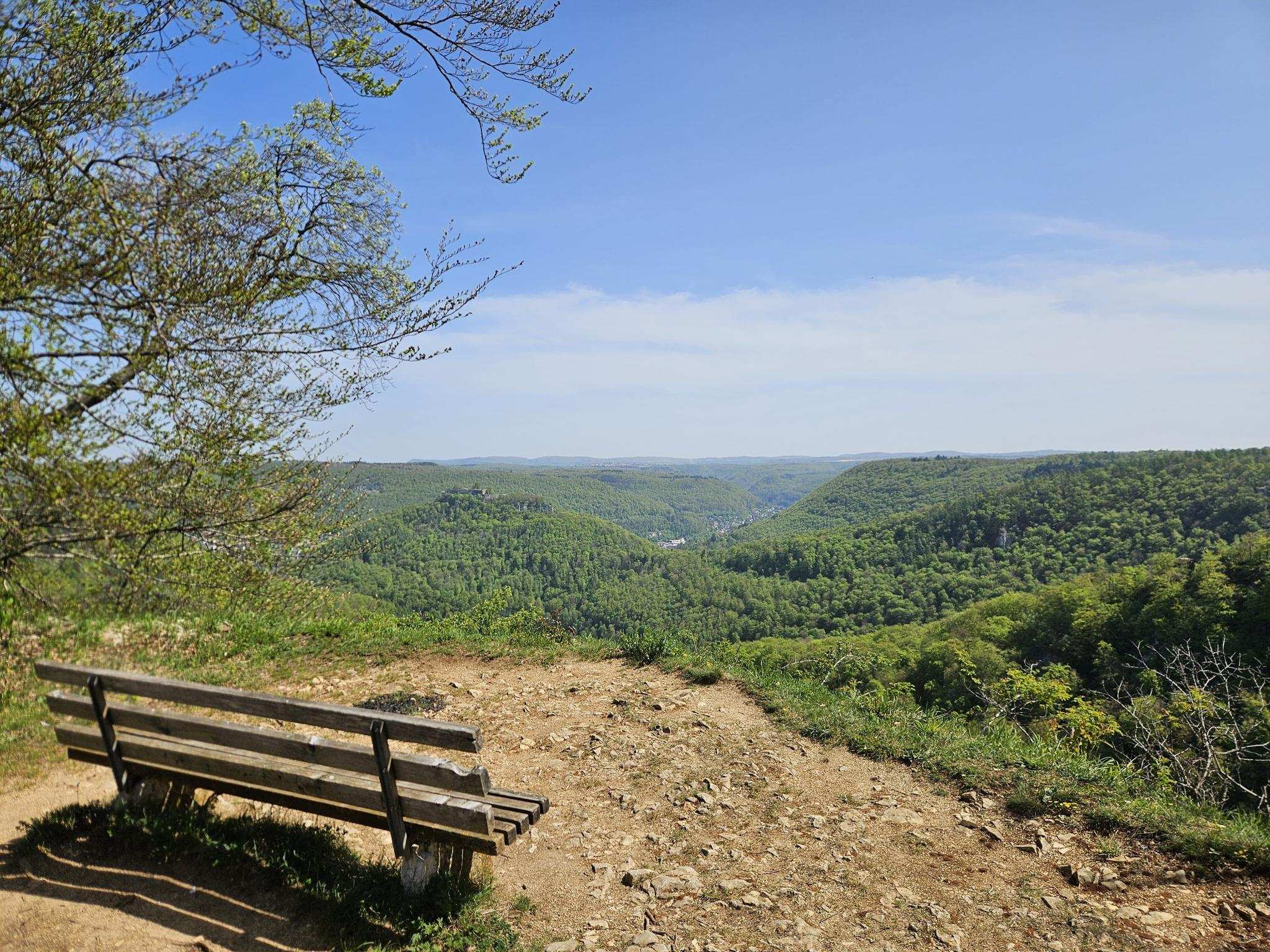 Traumhafte Aussicht auf den Hohen Urach und ins Ermstal, links vom Hohen Urach am Horizont ist noch der Hohe Neuffen zu sehen. Wer einen schönen Rastplatz für eine Verschnaufpause sucht, wäre sicher gut beraten diesen Platz (Rutschenfelsen) so in seine Route einzuplanen, dass er zur Pausenzeit hier ankommt.