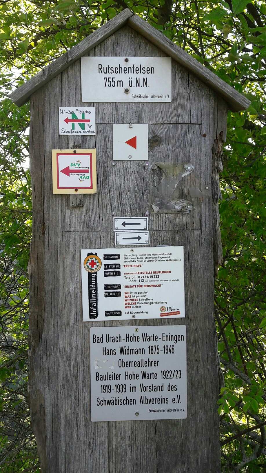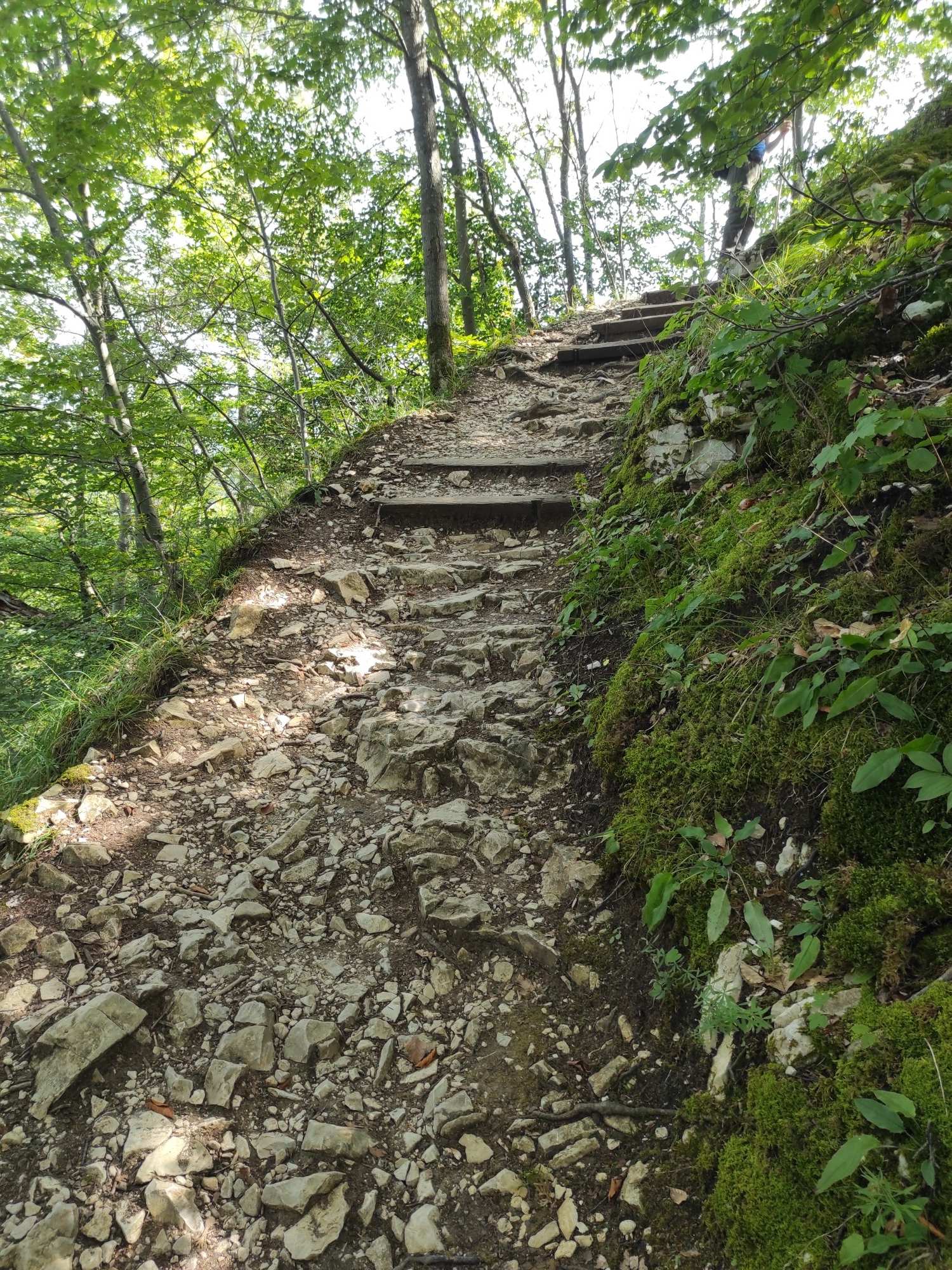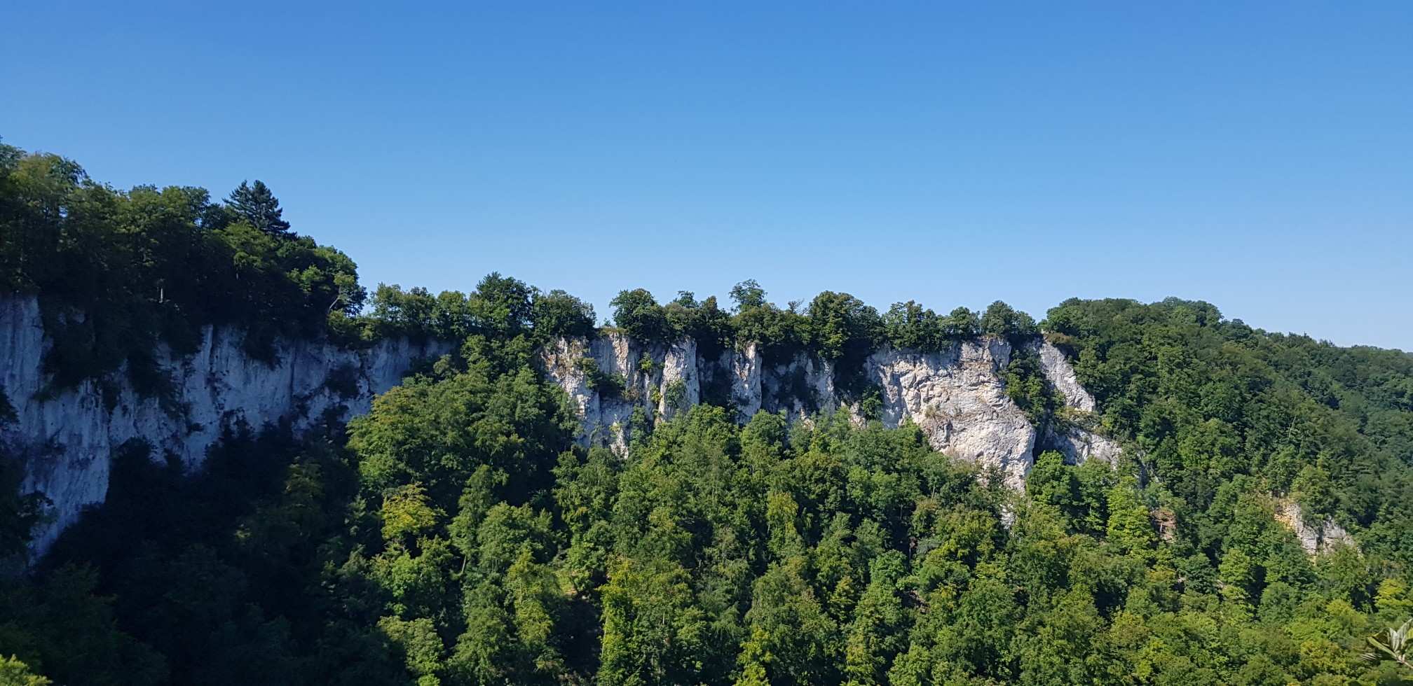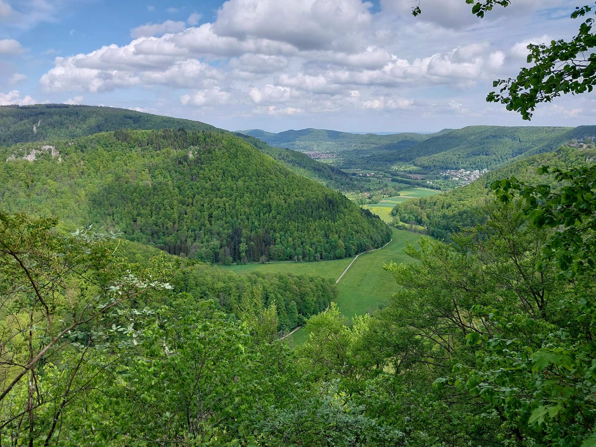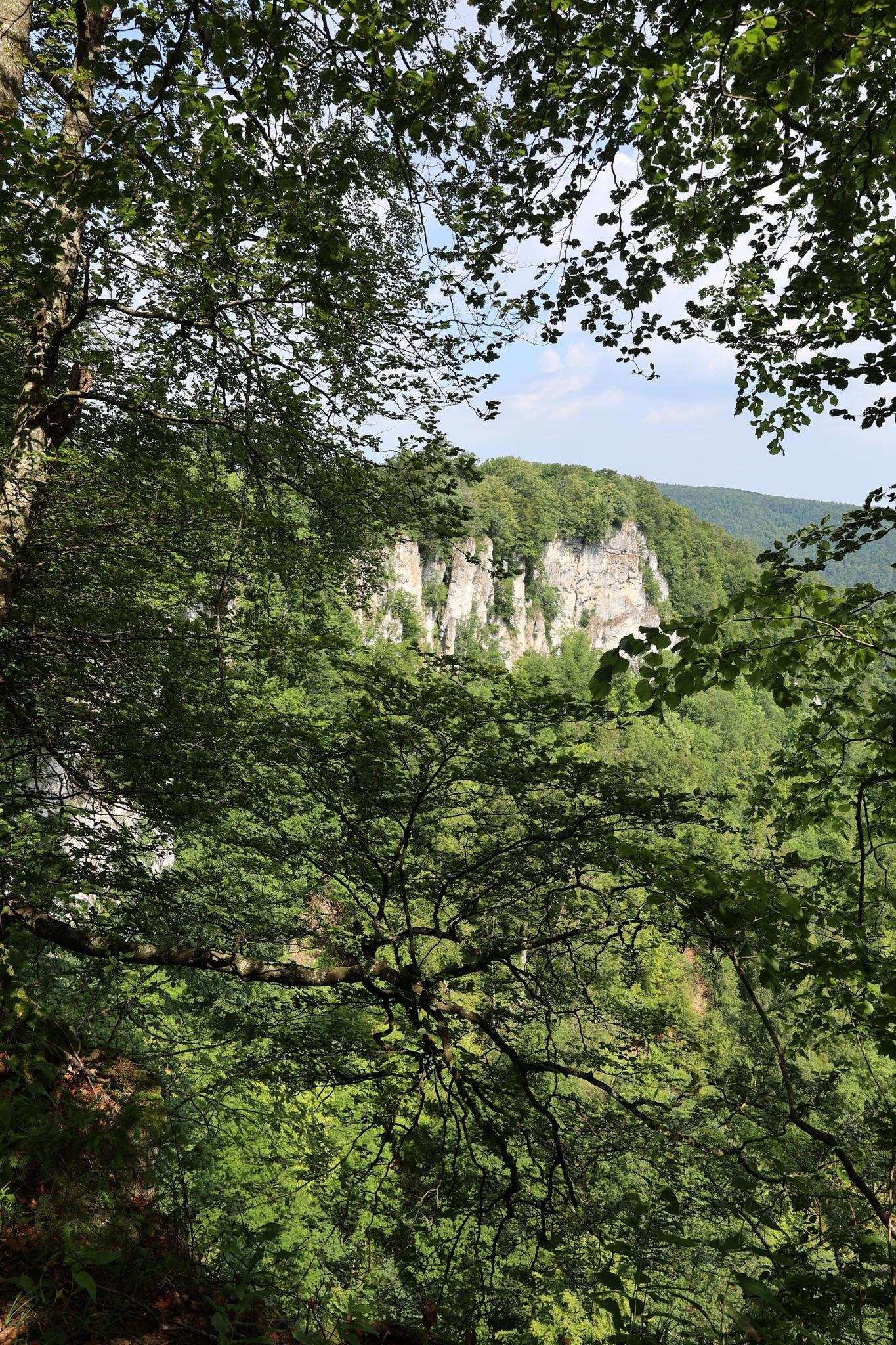 Traumhafte Aussicht auf den Hohen Urach und ins Ermstal, links vom Hohen Urach am Horizont ist noch der Hohe Neuffen zu sehen. Wer einen schönen Rastplatz für eine Verschnaufpause sucht, wäre sicher gut beraten diesen Platz (Rutschenfelsen) so in seine Route einzuplanen, dass er zur Pausenzeit hier ankommt.